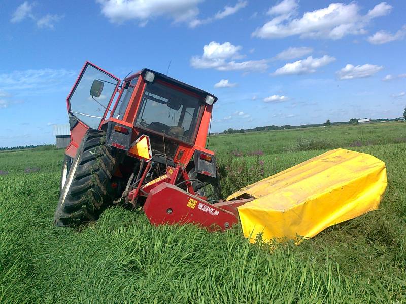 mullakin kerran käynnyt melkein samanlailla paitsi lipsahti vaan vasen puoli ojaan... ojanvarsia niitin ja sateen jälkeen hieman liukasta ja liian kovaa päisteeseen ja siitä lipsahti ojaan... toisella vedettiin ylös...