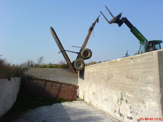 Juu on puikoissa. Naatti ei kanna ajaa päälle. Tuolla ylhäällä on laatta, jolle kippaillan sitten kun siilo täytty ja nostellaan kurottajalla siilon päälle. Kuormat käydään kippaamassa silppuria irroittamatta.